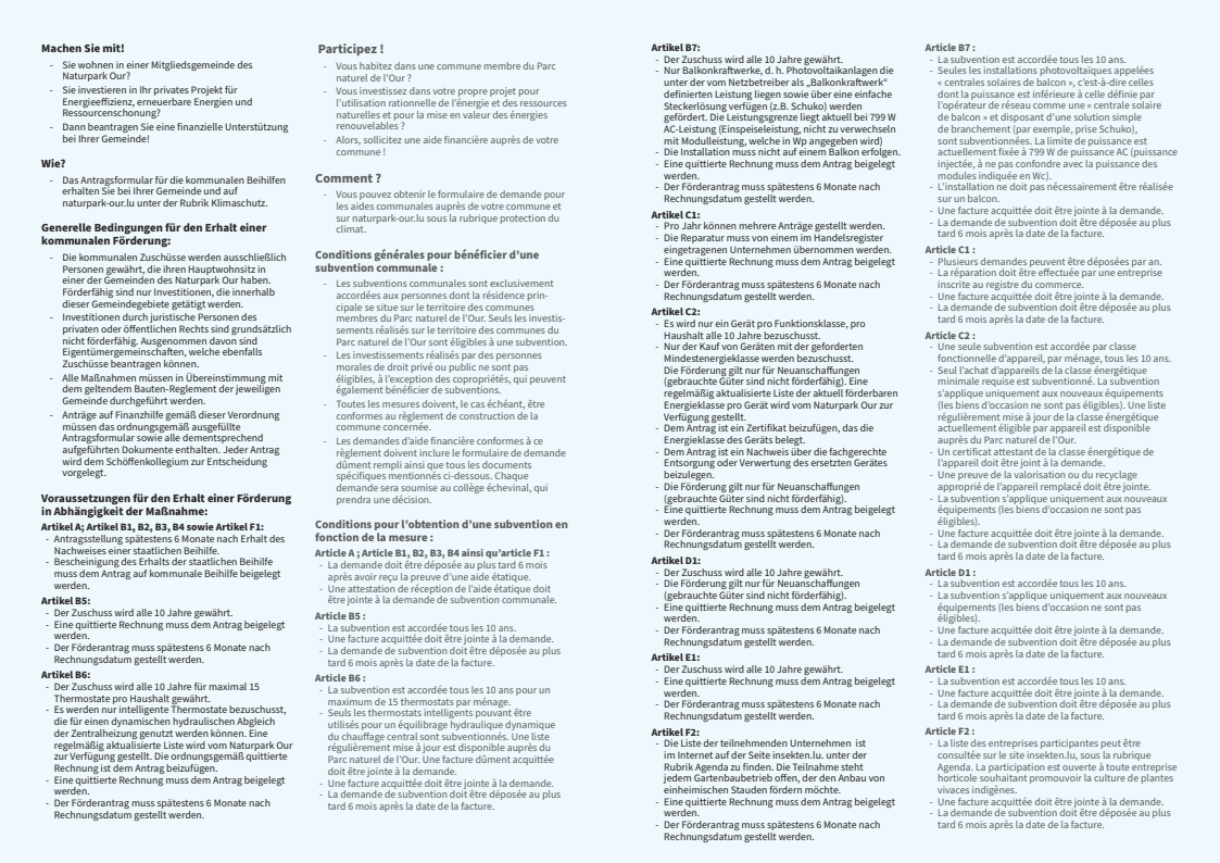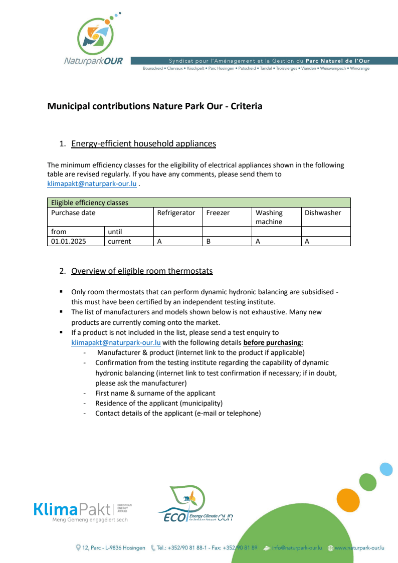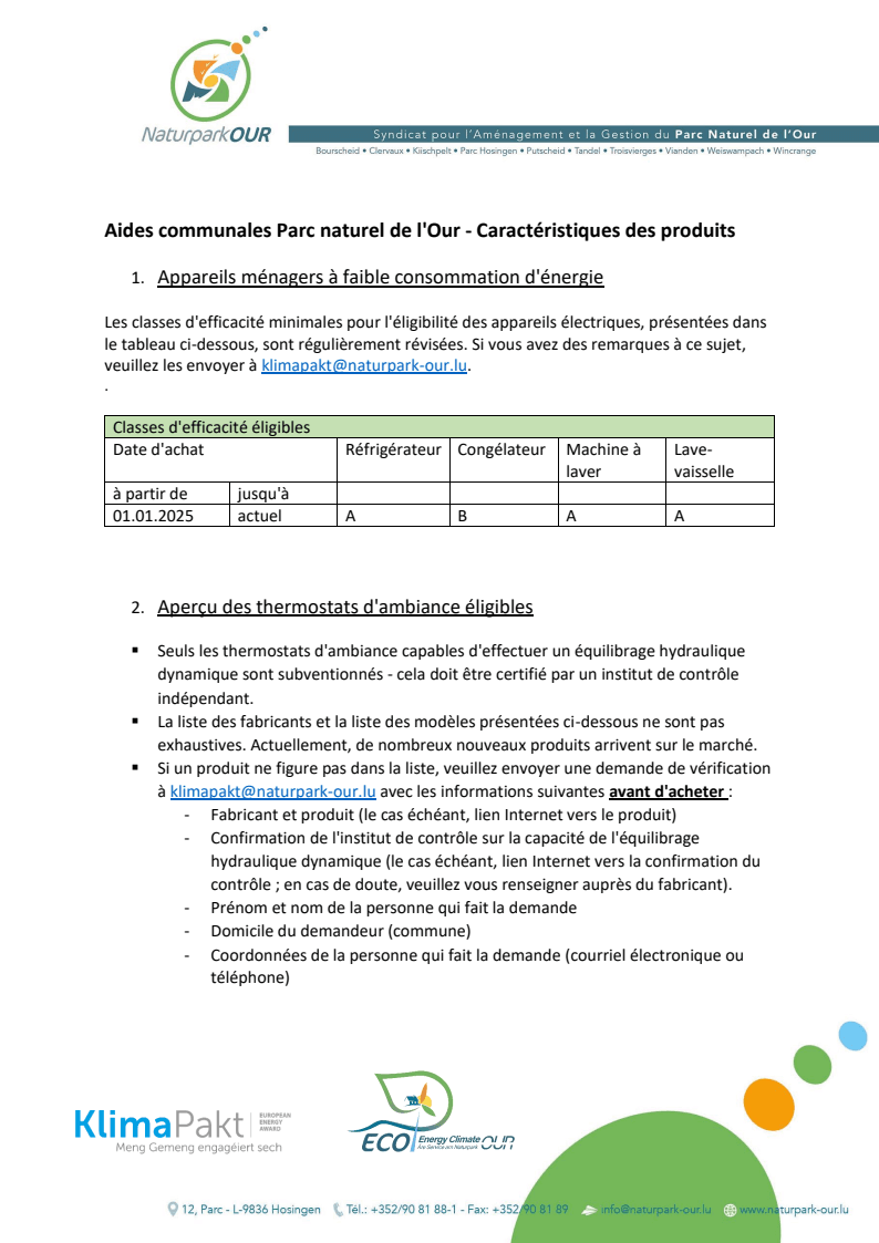 Les ménages privés dans les municipalités du Parc naturel de l’Our peuvent demander un soutien financier à leur municipalité lors de l’achat ou la mise en oeuvre de mesures liées à l’énergie et à l’environnement.