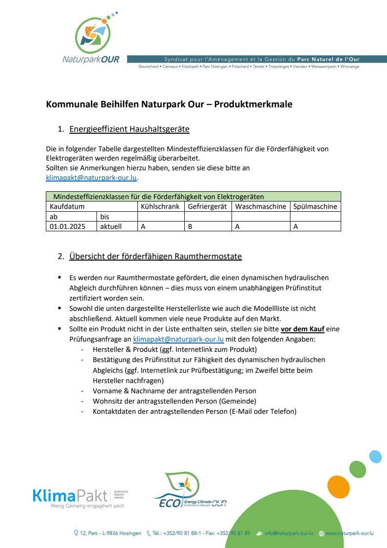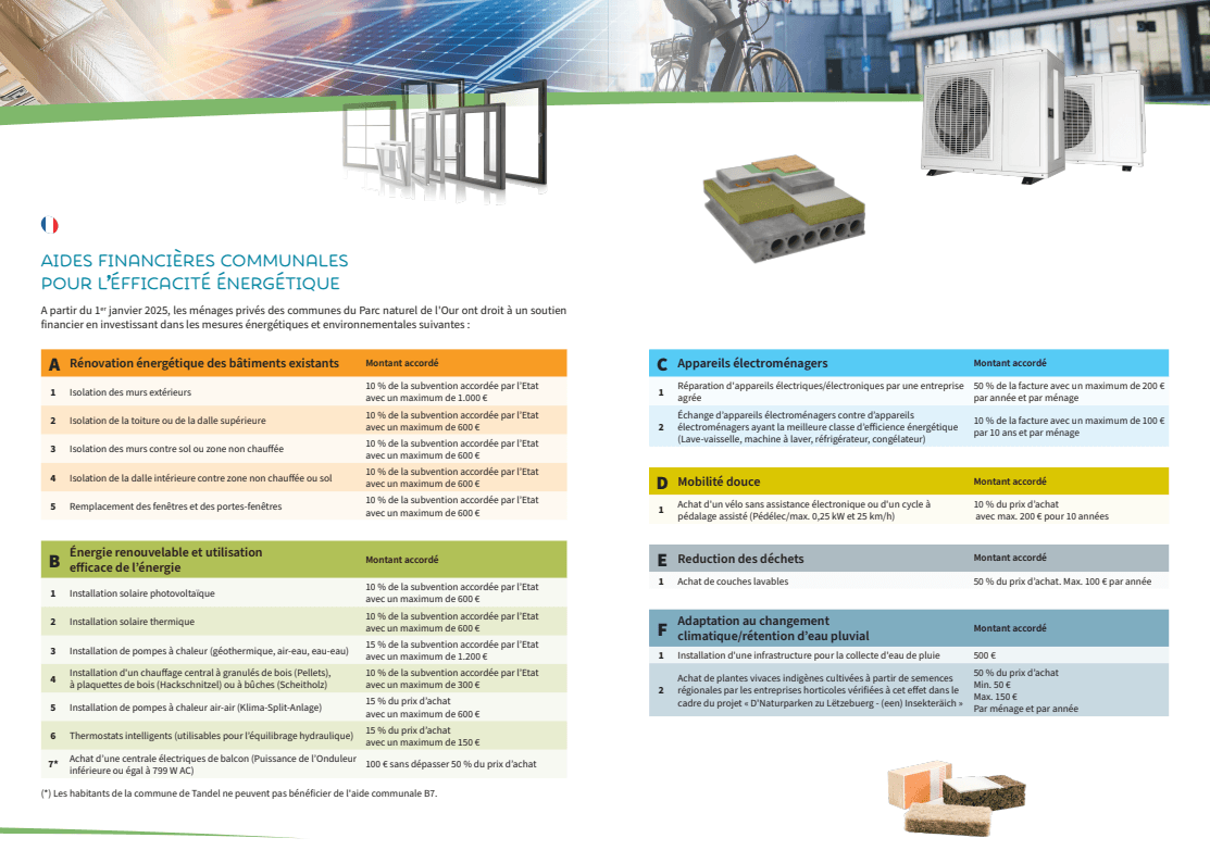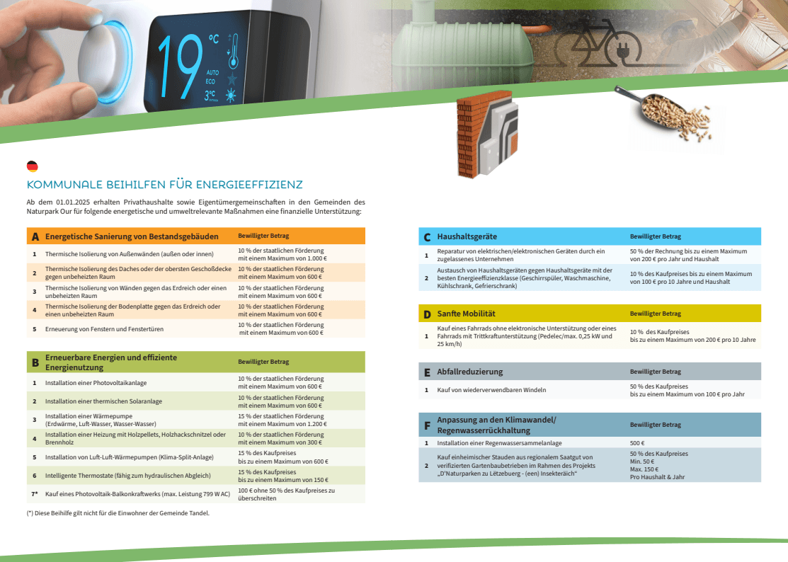 Privathaushalte in den Gemeinden des Naturpark Our und des Naturpark Öewersauer können bei Anschaffungen für energetische und umweltrelevante Maßnahmen eine finanzielle Unterstützung erhalten.